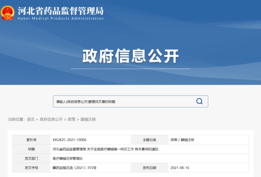 8月16日,河北省藥監局印發《關于實施醫療器械唯一標識工作有關事項的通知》(以下簡稱“《通知》”),規定2021年11月1日起生產的醫療器械應當具有醫療器械唯一標識,以及申請首次注冊、延續注冊或者注冊變更時,注冊申請人/注冊人應當提交產品標識。